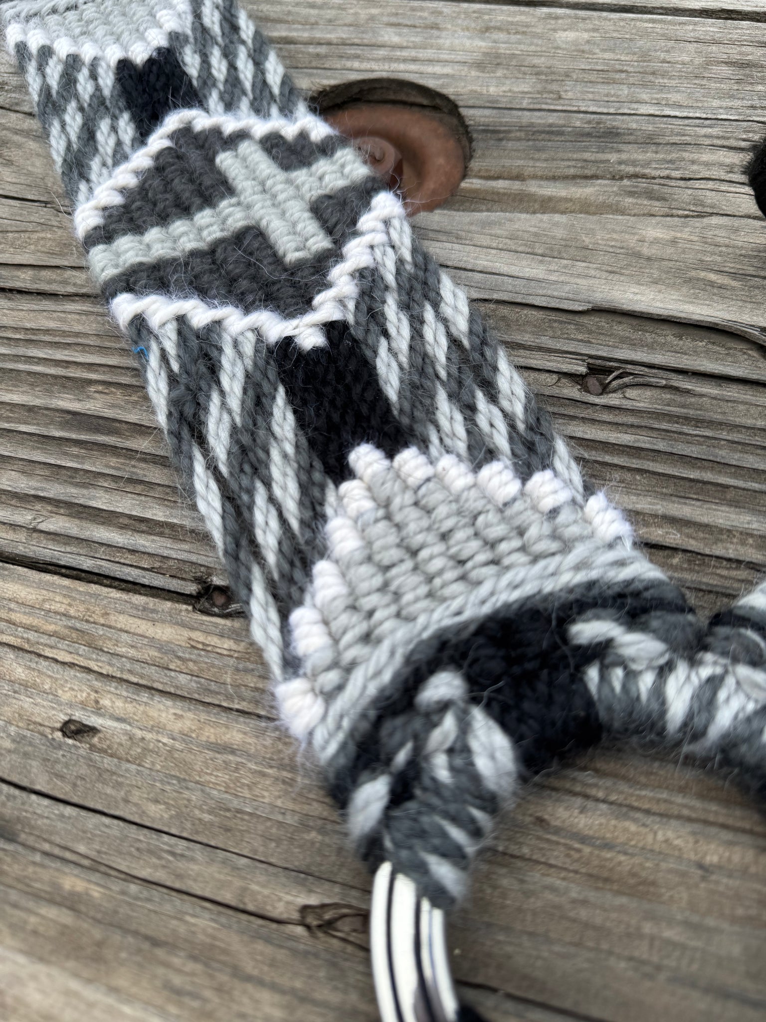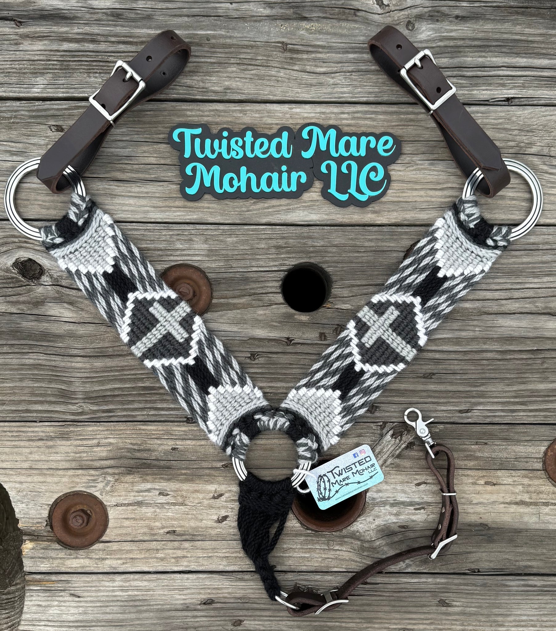 This breast collar features 11 strands of 100% mohair cinch cord tied onto beautiful floral Jeremiah Watt Stainless Steel hardware. This breast collar is an average size of 36” from ring tip to ring tip.
