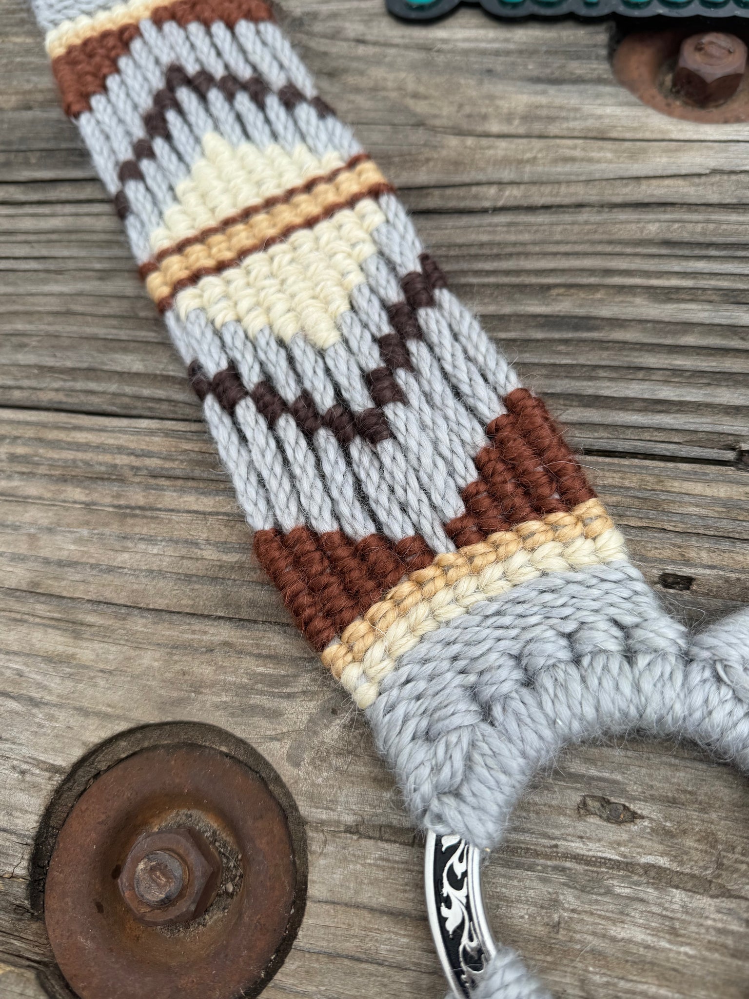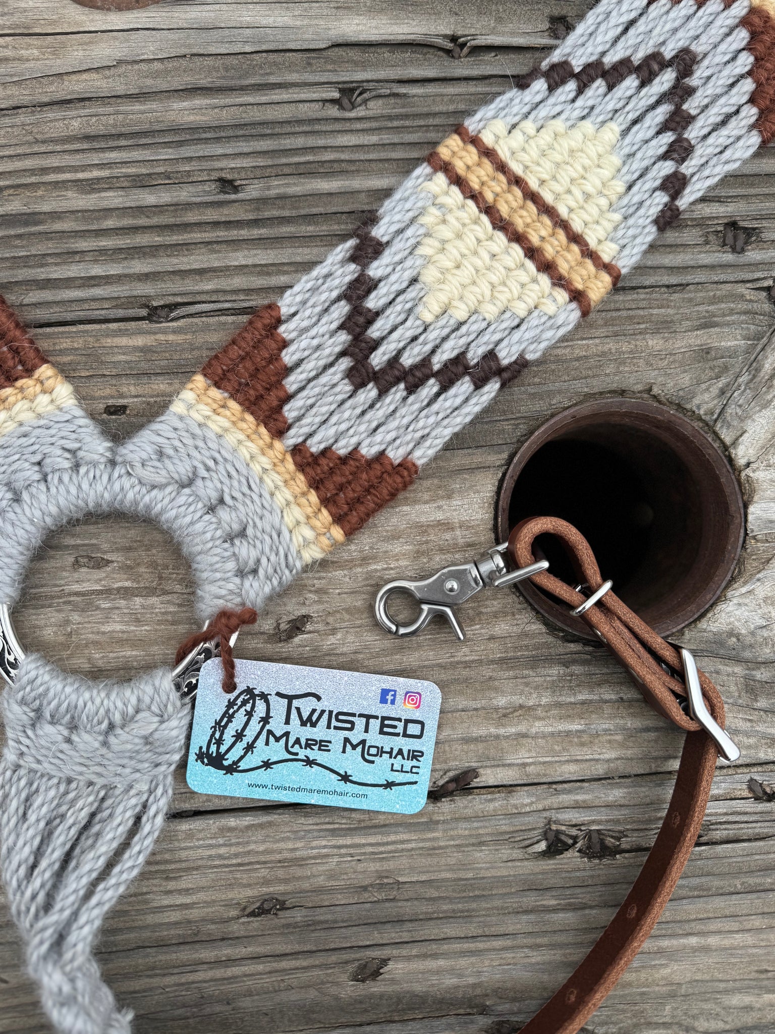 This breast collar features 11 strands of 100% mohair cinch cord tied onto beautiful black floral Jeremiah Watt Stainless Steel hardware. This breast collar is an average size of 36” from ring tip to ring tip.